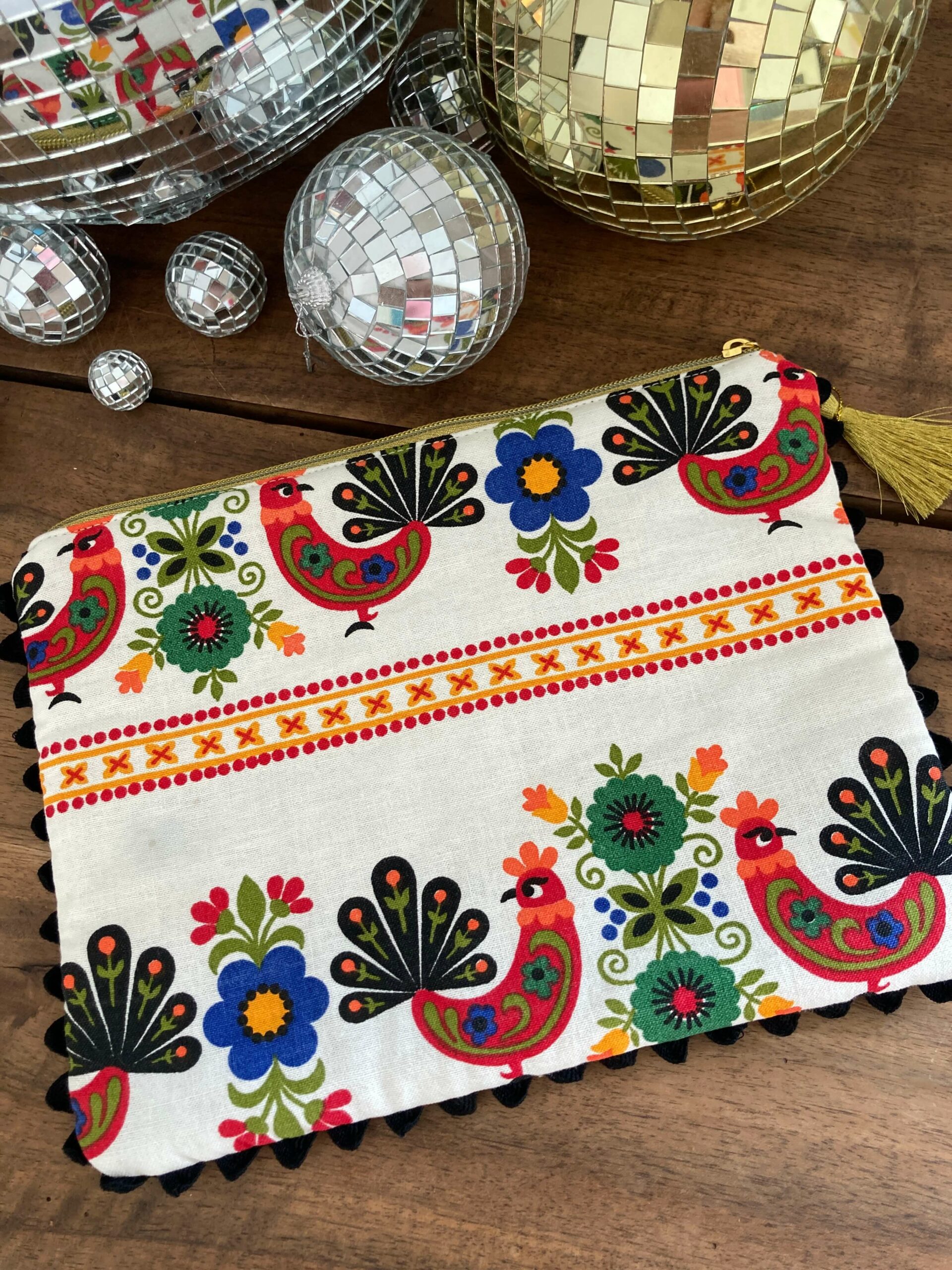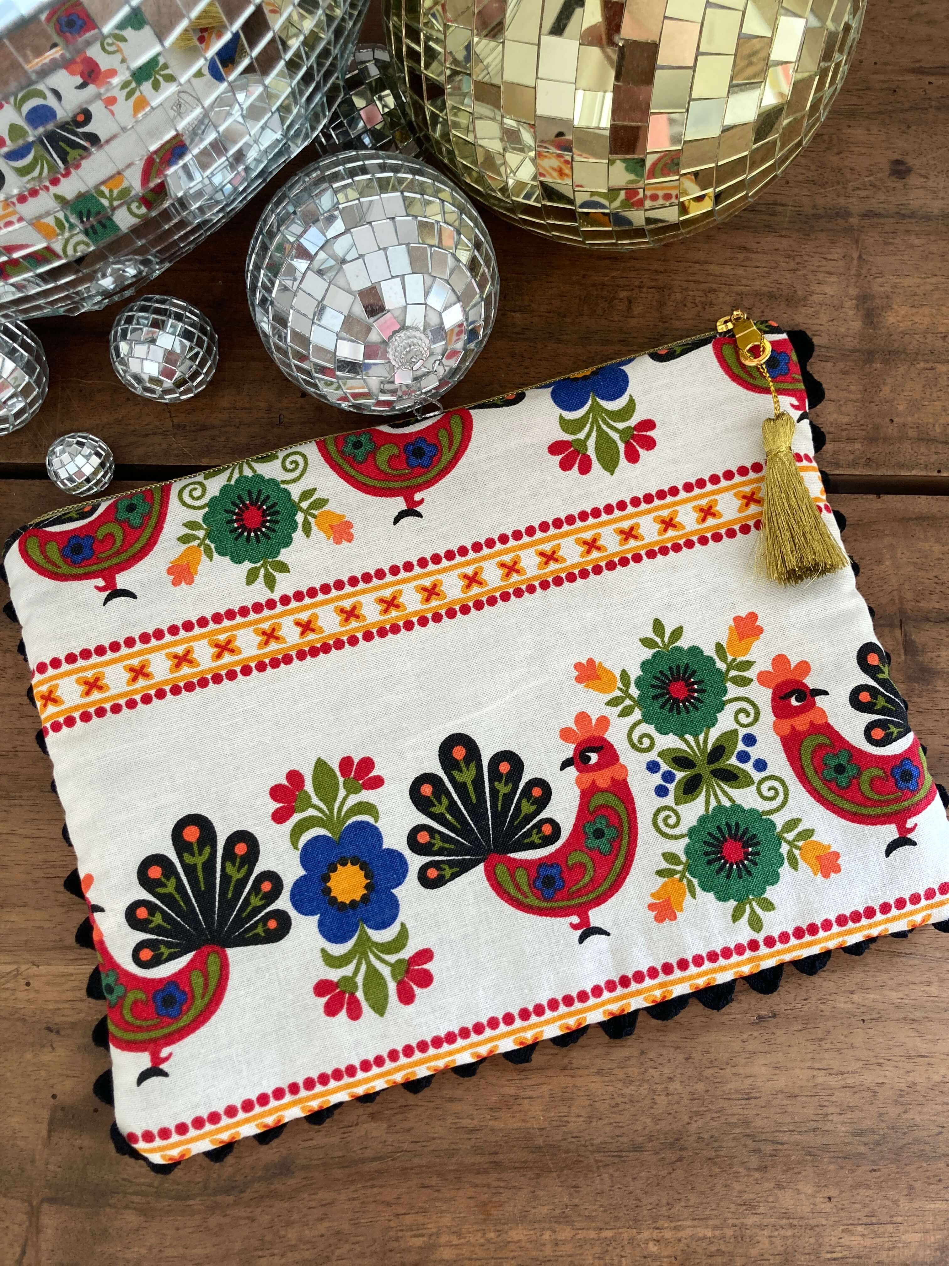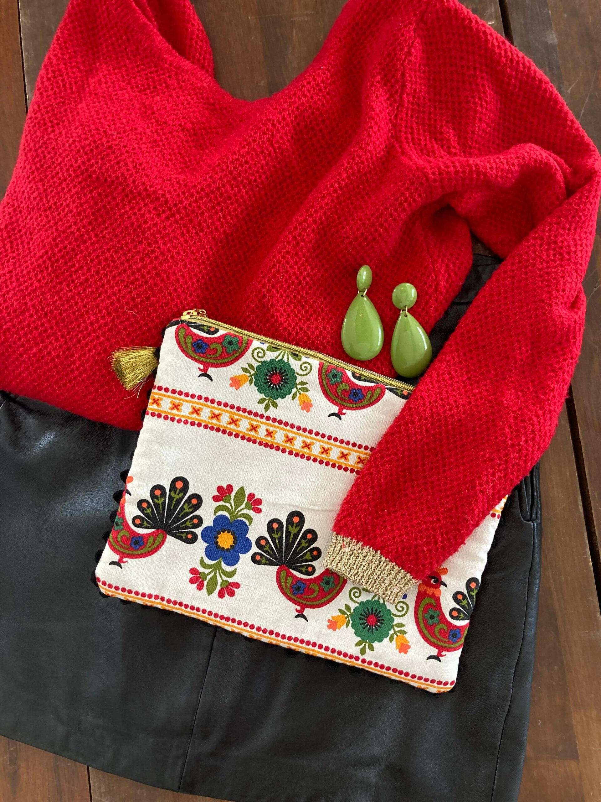Cette pochette a été pensée comme une petite œuvre textile, joyeuse et pleine de caractère. C’est un clin d’oeil à l’art populaire d’Europe de l’Est avec ses coqs colorés, ses fleurs généreuses et ses motifs symétriques.